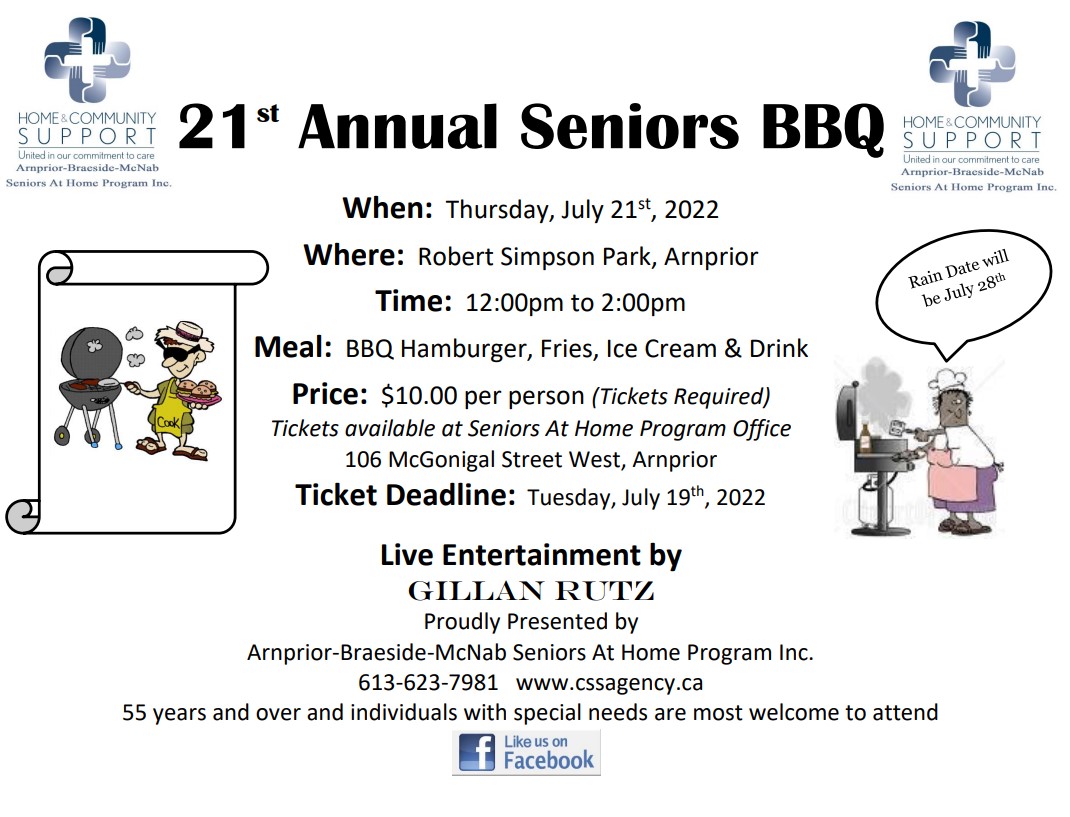 An enjoyable afternoon BBQ at Robert Simpson Park. Thursday, July 21st from 12pm-2pm. Meal includes hamburger, fries, icecream and drink. Musical entertainment by Gillan Rutz. All Seniors or adults with disabilities welcome. Tickets $10, available from agency office until Tuesday, July 19th. Rain date Thursday, July 28th.