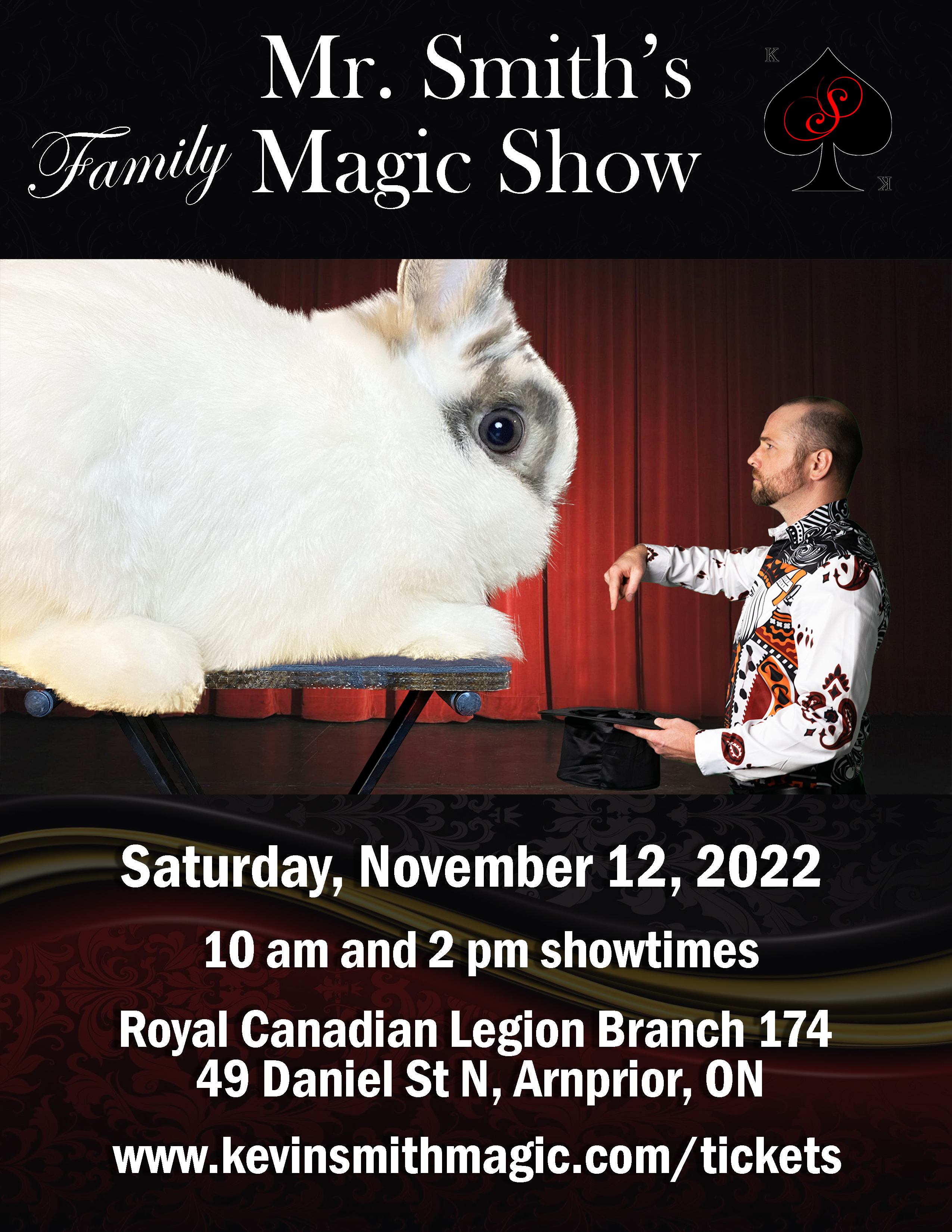 Kevin Smith Magic is performing in Arnprior, Ontario on November 12, 2022! Come check out Mr. Smith's family friendly magic show that will have all ages rolling in laughter. There are two shows, one at 10 am and one at 2 pm. Doors open 30 minutes before showtime. Early bird tickets are just $12 for children. Previous shows have sold out, so be sure to get your tickets ASAP!