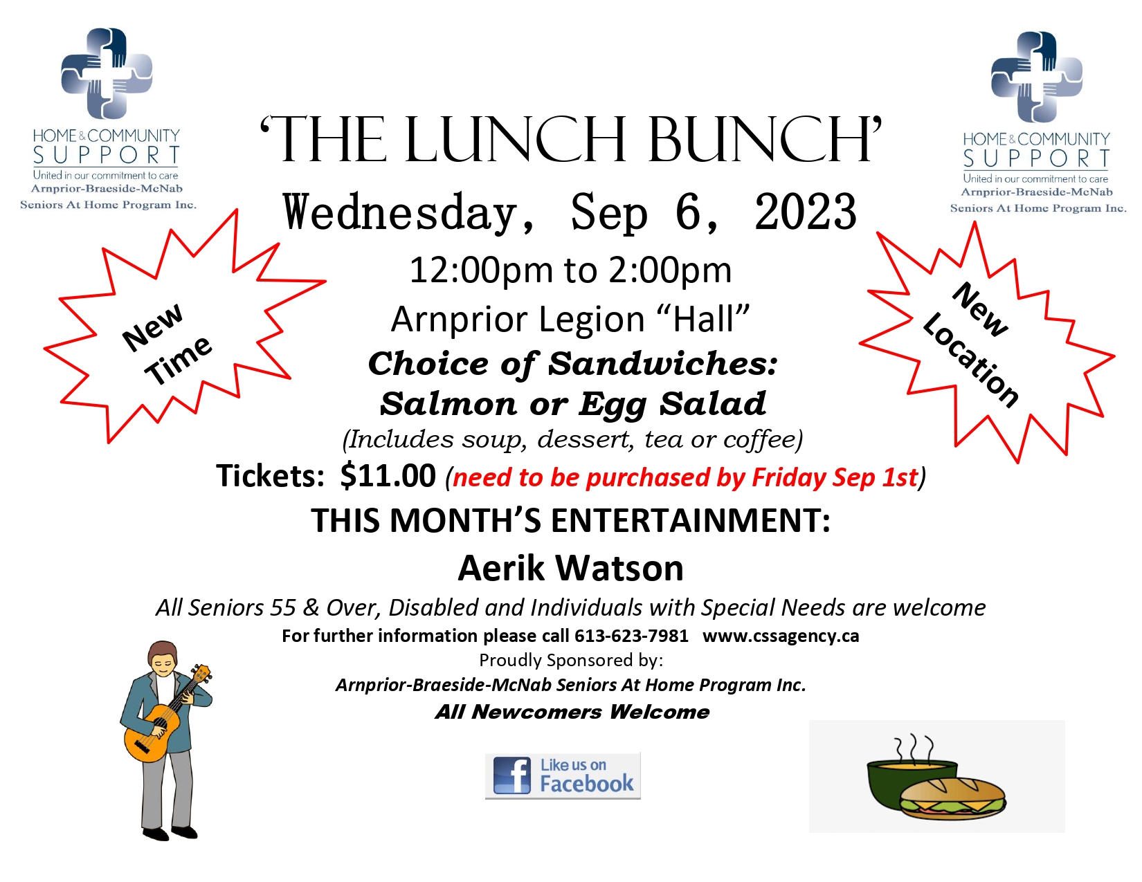 A full course luncheon event on Wednesday, Sep 6 from 12-2pm at the Legion Hall. Choice of sandwiches salmon and egg salad. Musical entertainment by Aerik Watson. Tickets $11 available from Seniors at Home office until Friday Sep 1. All seniors and adults with disabilities welcome.