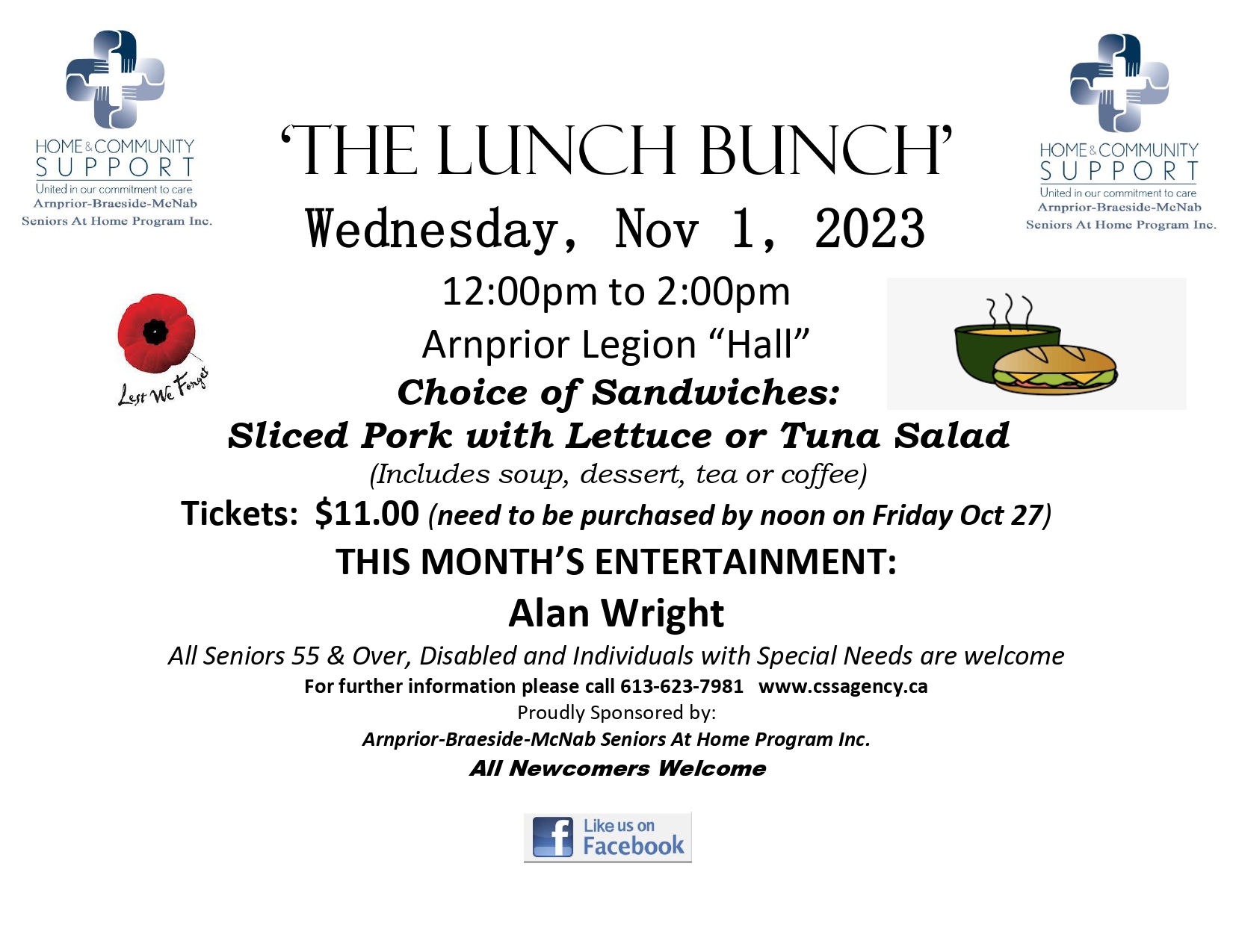 A full course luncheon event at the Arnprior Legion Hall on Wednesday, November 1st from 12-2pm. Choice of sandwiches sliced pork with lettuce or tuna salad. Alan Wright will entertain. Tickets are $11 available from the Seniors at Home office until noon on Friday October 27th. All seniors or adults with disabilities welcome.