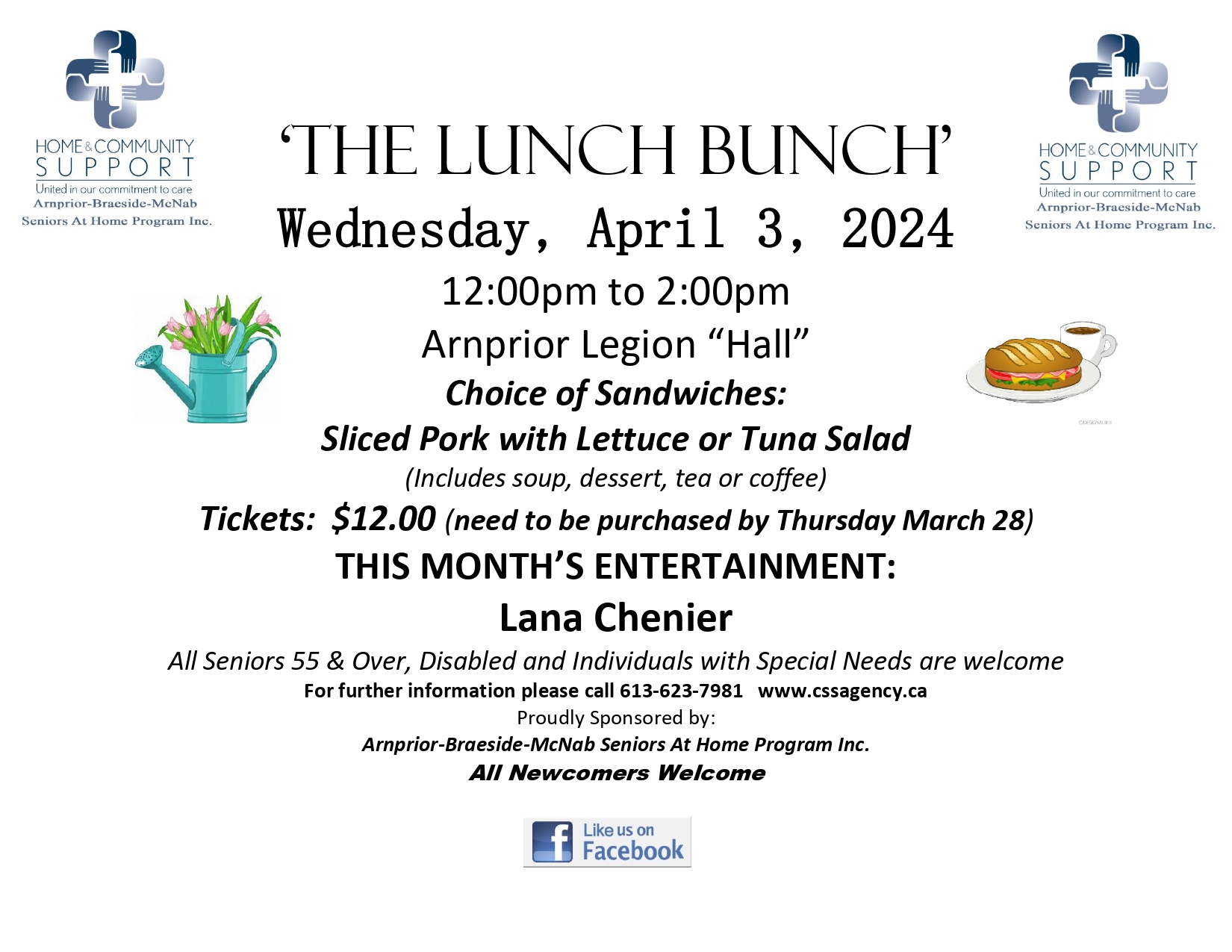 A full course, luncheon event at the Arnprior Legion Hall on Wednesday, April 3rd from 12-2pm. Choice of sandwiches sliced pork with lettuce or tuna salad. Lana Chenier will entertain. Tickets $12 each available from the agency office until Thursday March 28th. All seniors and adults with disabilities welcome.