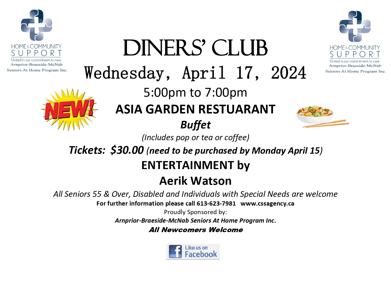 A Chinese buffet, including pop, tea or coffee, at the Asia Garden Restaurant on Wednesday, April 17 from 5-7pm. Entertainment by Aerik Watson. Tickets $30 available from agency office until Monday April 15th. All seniors or adults with disabilities welcome.