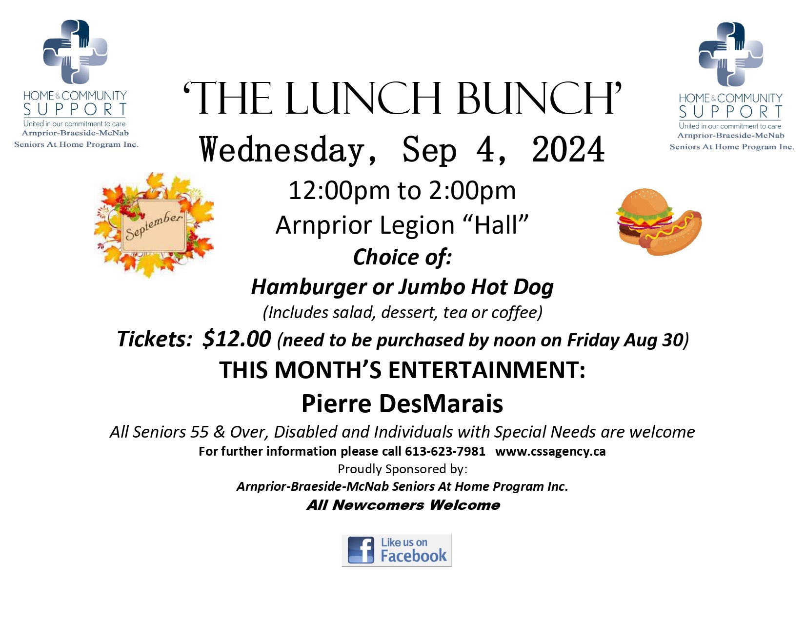 A full course luncheon event at the Arnprior Legion Hall on Wednesday, Sep 4th from 12-2pm. Lunch is choice of hamburger or jumbo hot dog. Pierre DesMarais will be entertaining. Tickets $12 each available from our agency office until noon on Friday Aug 30. All seniors or adults with disabilities welcome.