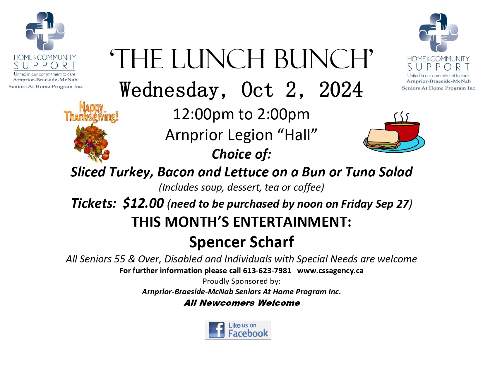 A full course luncheon event at the Arnprior Legion Hall on Wednesday, Oct 2 from 12-2pm. Choice of sandwiches turkey, bacon and lettuce on a bun or tuna salad. Spencer Scharf will entertain. Tickets $12 available from the agency office until noon on Sep 27th. All seniors or adults with disabilities welcome.
