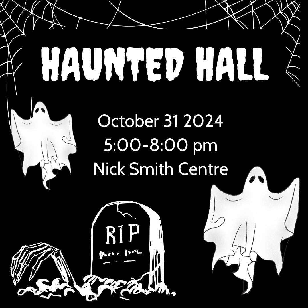 Join us for a spooky evening walking through the Haunted Hall of the Nick Smith Centre! All ages are welcome, and costumes are encouraged! Drop in on your trick or treating as we will have lots of treats, scares and fun.