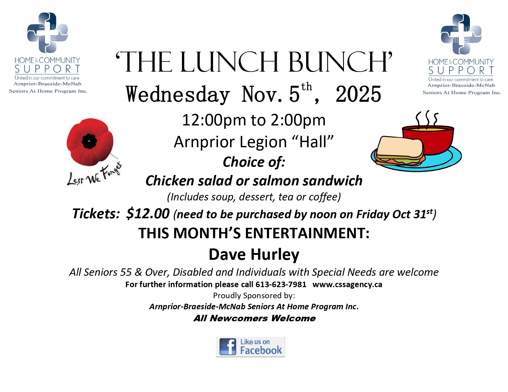 A full course luncheon event at the Arnprior Legion Hall on Wednesday, Nov 5th from 12-2pm. Choice of sandwiches chicken salad or salmon. Dave Hurley will entertain. Tickets $12 each until noon on Friday Oct 31. All seniors or adults with disabilities welcome.