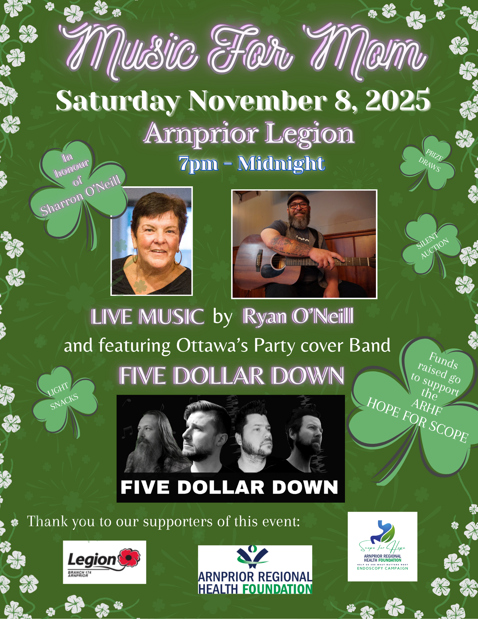 Please join us for a fun-filled night of music, stories, rememberence and fun in honour of Sharron O'Neill a long time resident of the Arnprior area and volunteer at the Arnprior Hospital. Along with her son Ryan O'Neill sharing stories, memories of Sharron and some of her favourite tunes, music from the Ottawa party band Five Dollar Down, the evening will also include food, prizes and a silent auction with all proceeds going to support the Arnprior Hospital Foundation's Hope for Scope Campaign which is raising money for new endoscopy equipment. Entry is free and donations can be made at the door. Come on out on November 8th to help us make a meaningful contribution to our local medical community at the Arnprior Legion at 7pm.