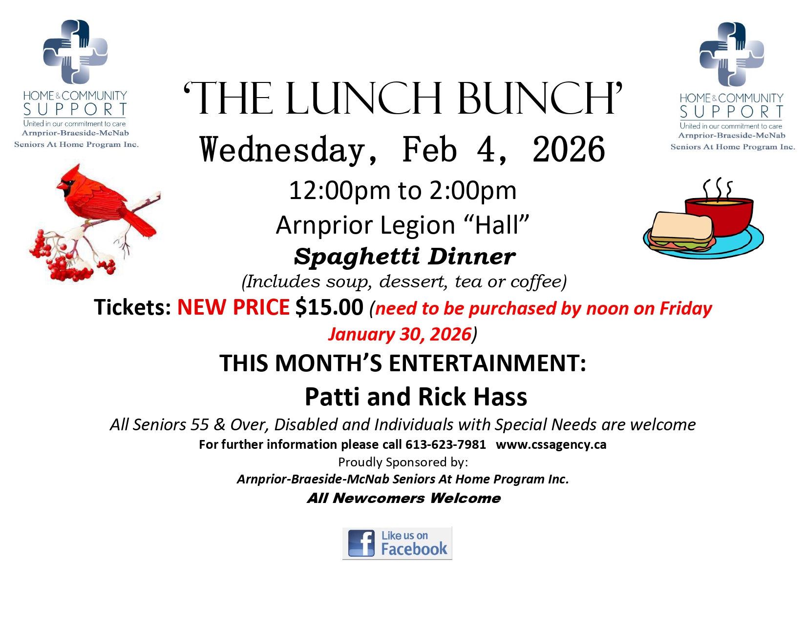 A full course luncheon Wednesday February 4th from 12-2pm will be held at the Arnprior Legion. This month we are offering spaghetti (includes soup dessert tea or coffee) live music by Patti and Rick Hass tickets are $15 each. All seniors and adults with disabilities welcome. Tickets can be purchased at the agency office deadline is Friday Jan 30th at noon.