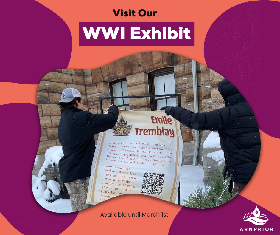 Arnprior + District Museum invites you to tour our new outdoor exhibit on WWI veterans created in collaboration with local Grade 10 History students. This town-wide project shares local stories at a few familiar community stops: the Cenotaph, the Library, the Legion, the Museum and Town Hall (2nd Floor). It's free to visit, easy to explore, and a great reason to take walk through downtown and see these places in a new way. Let us know what you think of the amazing work by local ADHS students!