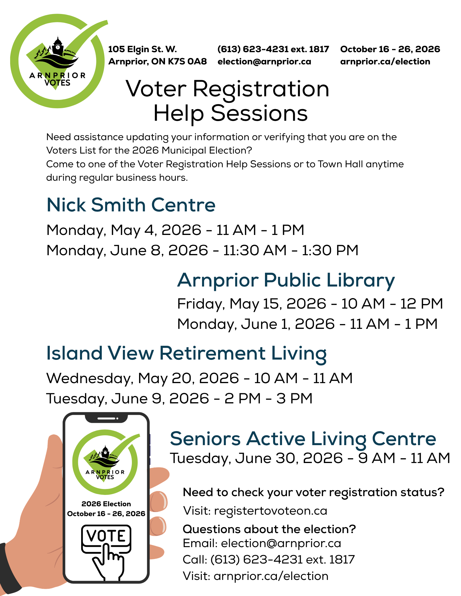 Need assistance updating your information or verifying that you are on the Voters List fo the 2026 Municipal Election? Come to one of the Voter Registration Help Sessions, hosted by the Clerk's Office.