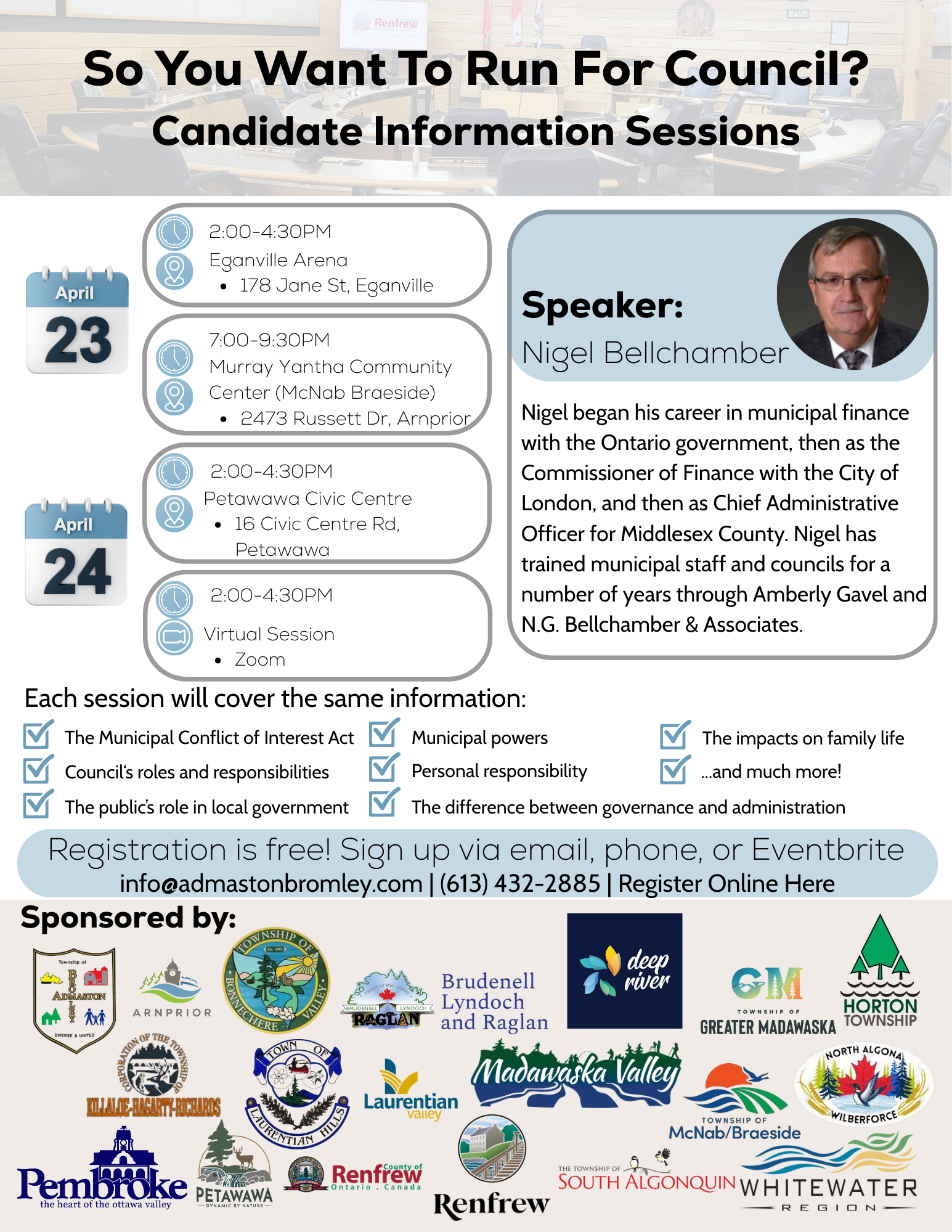 The sessions will be led by Nigel Bellchamber, an experienced municipal professional who has worked in municipal finance with the Ontario government, served as Commissioner of Finance for the City of London, and as Chief Administrative Officer for Middlesex County. He has also trained municipal staff and councils through Amberly Gavel and N.G. Bellchamber & Associates.