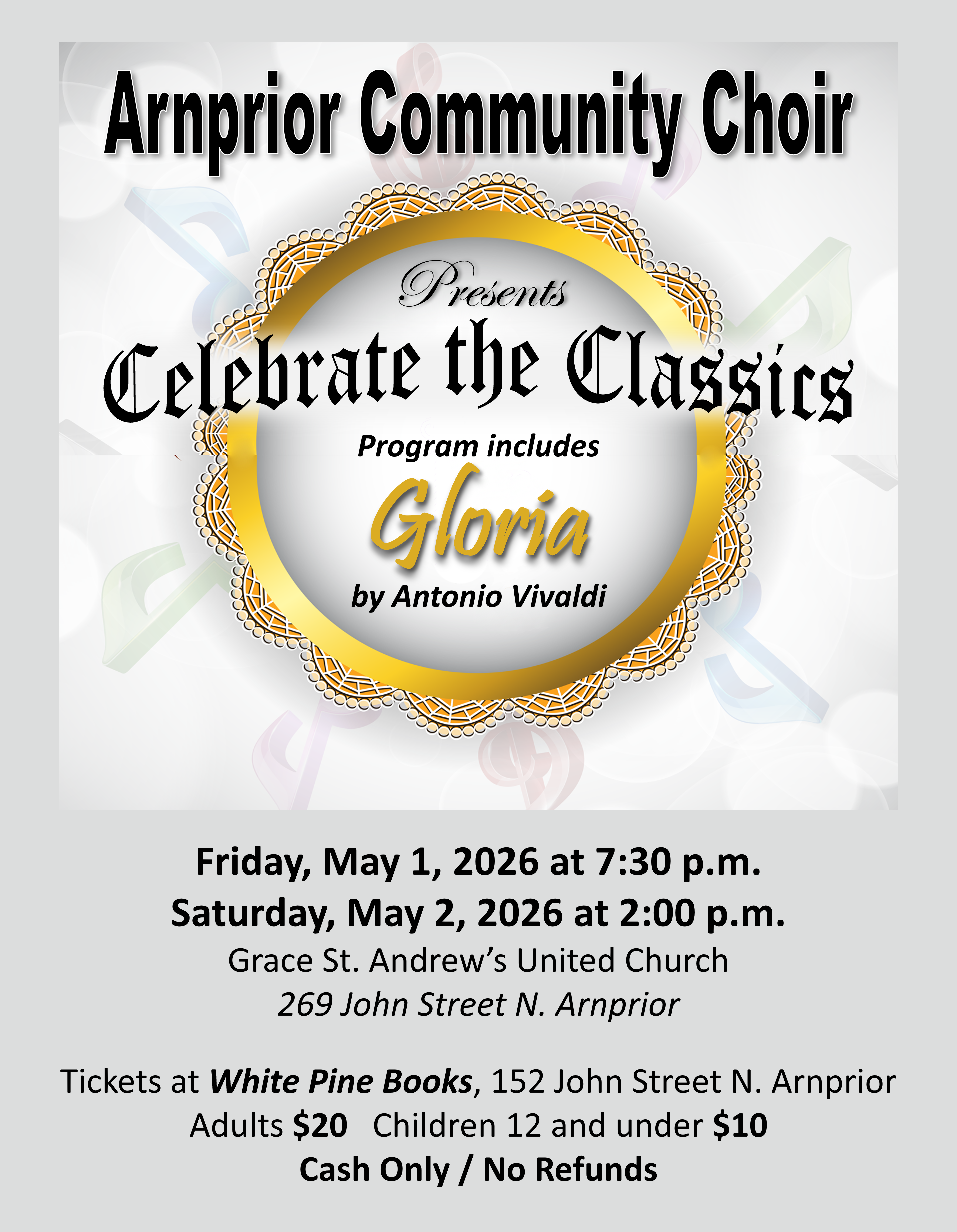 Tickets: Adults $20, Children 12 and under $10. Tickets available now at White Pine Books, Arnprior. Cash only.