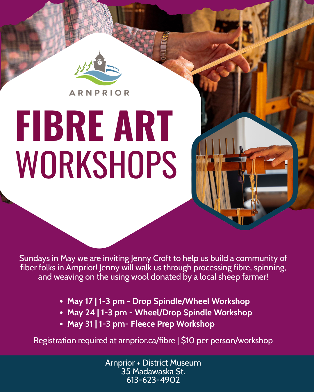 As part of our May workshops, Local Spinner and Weaver Jenny Croft will lead a free, family-friendly public fiber arts drop in on June 14th at 2 pm at Arnprior + District Museum. Find out about our new loom and spinning equipment that are available for public use. Join others as they get hooked on more fiber skills using old timey tools!
